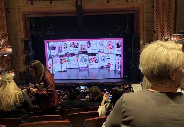 The day finally arrived when I entered the theater to see Mean Girls. The background of the stage was filled with pages from the Burn Book to set the tone of the show.