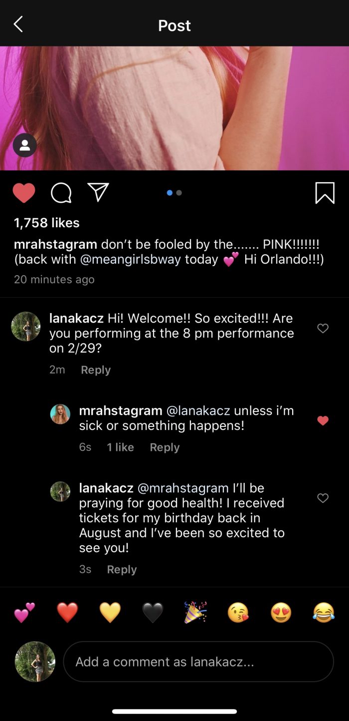 This past August, for my birthday, my parents let me choose two musicals to see at the local Dr. Phillips Performing Arts Center. I instantly knew my two choices would be Les Misérables and Mean Girls and I decided to Google who the cast would be for each production. There, I discovered that Mariah Rose Faith would be debuting as Regina George in the touring cast. I was super excited to see her live, but I was concerned that I would end up seeing an understudy instead. I figured I’d have to wait until February to confirm whether I’d see her live or not. When Mariah posted in Instagram that she was in Orlando, I reached out to her via her post to ask if she would be starring in the performance I was going to. I was thrilled when she actually responded to my comment and confirmed that she would be performing “unless [she’s] sick or something happens!” This only increased my anticipation as I waited for the day of the performance.